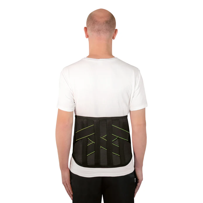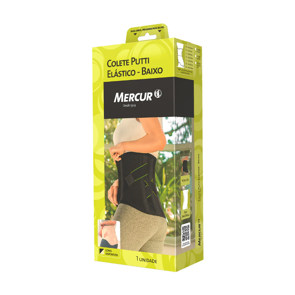 Confeccionado em elástico resistente é ajustável por fechos aderentes e possui reforço lateral, indicado para a região lombossacral.